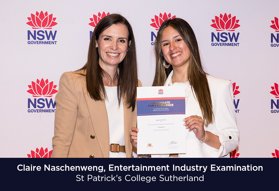 - Claire Naschenweng, Entertainment Industry Examination, St Patrick’s College Sutherland (course studied at Southern Cross Catholic College Burwood)