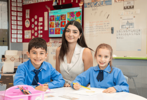 A photo of a teacher smiling at the camera with two happy students baden.parkerbrown@syd.catholic.edu.auJuly 18, 2025| FacebookXEmail